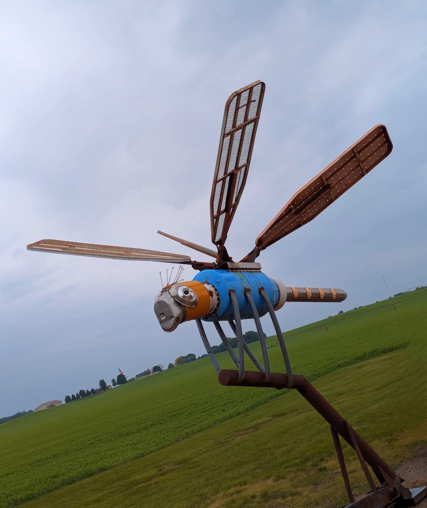 It all began when my husband came home from a trip to New York City with a dragonfly lamp. Since then I have accrued quite a collection. Not just dragonfly lamps, but dragonfly stuff! I have necklaces, bracelets and pins, purses and shirts, bookmarks and magnets, and other various dragonfly doodads. Even my checkbook features dragonflies. I have a ‘thing’ for dragonflies! So when I was visiting my daughter in Hastings, MN and saw this unusual sculpture of a dragonfly I had to take a picture: